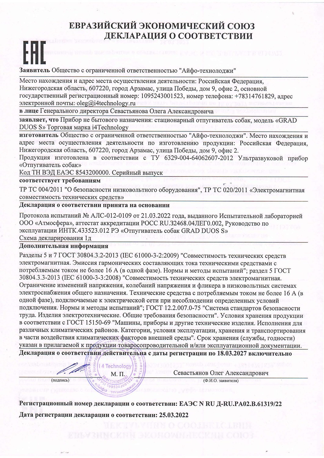 Приобрести стационарный отпугиватель собак "Grad Duos S" по низкой цене в Темрюке очень просто: для этого достаточно оставить заявку нашим операторам в онлайн-чате или по email.