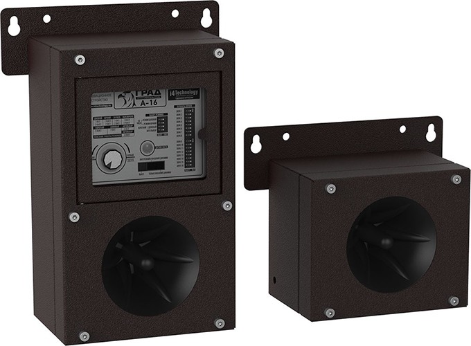 Отпугиватели "Град А-16" и "Град А-16 Pro" отличаются широкими возможностями по расширению системы. Если одного динамика для ваших нужд будет недостаточно, можно заказать два, три или даже четыре громкоговорителя, увеличив защищаемую площадь вплоть до 35000 кв. м. Обычно они располагаются с учетом ландшафта, а если территория ровная, то рекомендуется круговой монтаж колонок с их направлением в разные стороны.